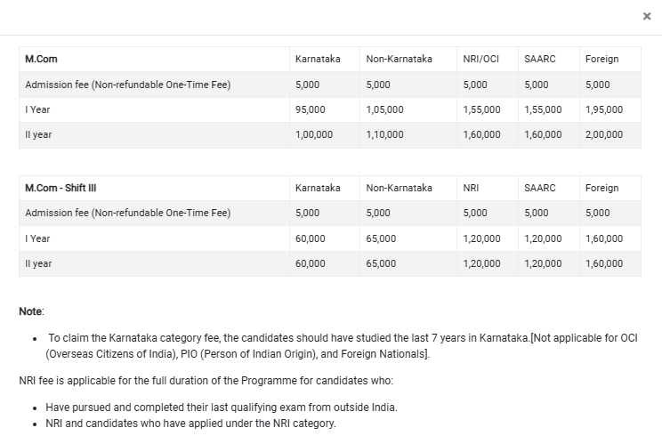 For students applying under the NRI quota for admission, the total course fee for M.Com at SJU Bangalore is ₹ 3.2 Lakhs.