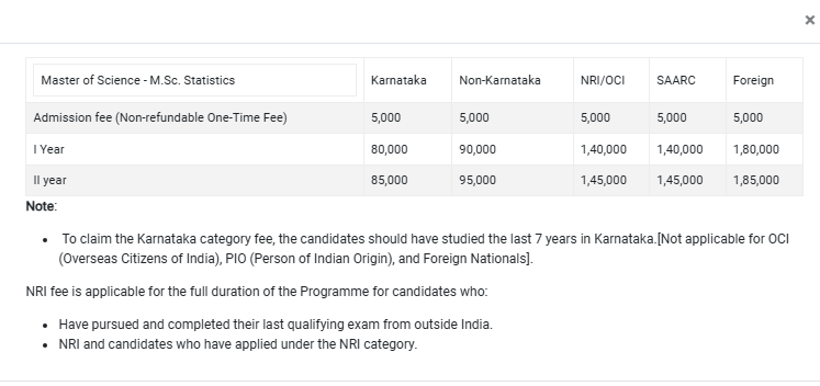 For students applying under the NRI quota for admission, the total course fee for M.Sc Statistics at SJU Bangalore is ₹ 2.9 Lakhs.