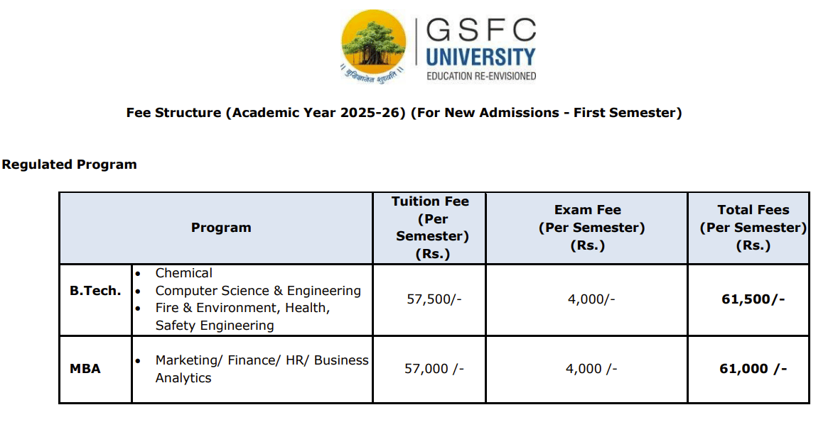 GSFC University Vadodara B.Tech Fire & Environment, Health, Safety fees in first year is ₹ 1.27 Lakhs. The detailed fees is mentioned below.GSFC University Vadodara Hostel Fee for Male is ₹ 54,760 to 56,760. Hostel Fee for Female at GSFC University Vadodara is ₹ 54,760.