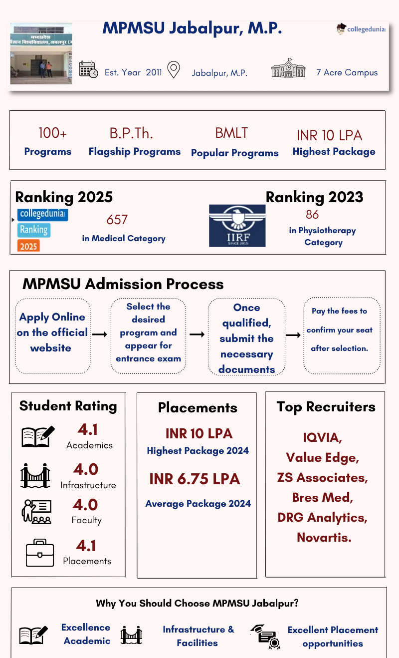 Madhya Pradesh Medical Science University (MPMSU), Jabalpur is a state university established in 2011 by the Government of Madhya Pradesh.MPMSU is recognized by the University Grants Commission (UGC) and the Medical Council of India (MCI). It is the governing body for all the Dental, Nursing, Medicine, Paramedical, Homeopathic, Ayurvedic, Unani, and Yoga colleges in Madhya Pradesh. The university has been ranked 657th by Collegedunia Ranking under the Medical category in 2025.