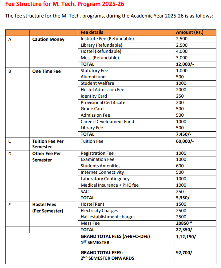 Earlier, M.Tech Computer Science And Engineering fees at IIIT Naya Raipur was ₹ 2.61 Lakhs (in 2024) for the entire course duration. This shows a fee increase of ₹ 10,450 over the year.