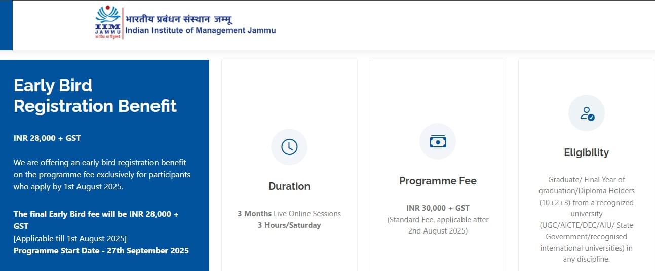 Find detailed IIM Jammu Executive Programme Digital Marketing fees, eligibility, admission dates, cutoff and ranking below.