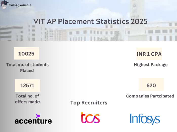 Around 50 students have been placed as of now. TCS group stands out as the top recruiter for VIT AP 2024 placements, having made 123 offers in various categories. As of now, the highest package offered to VIT AP University students is INR 27 LPA and the average package stood at INR 14.43 LPA. In the 2023 VIT AP placements, the highest package offered was INR 34.4 LPA and the average placement package was INR 7. 19 LPA.