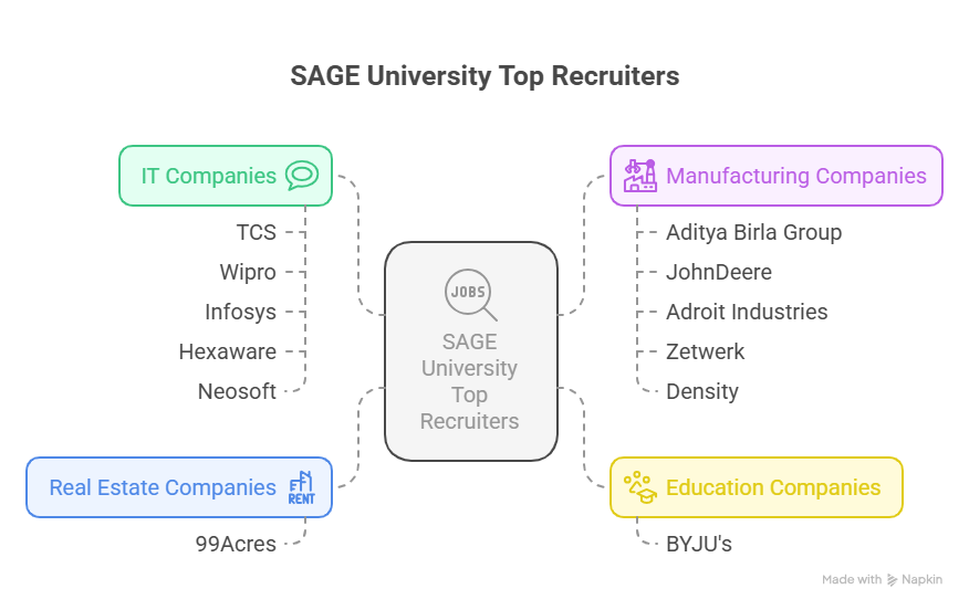 SAGE University has a robust placement system with numerous companies visiting annually, including major firms like Infosys, TCS, Wipro, Amazon, and Google. The highest package offered recently was 45 LPA in the B.Tech department and 1.3 crore in the MBA department. Average salary packages range from 3.5 to 6 LPA, depending on the course.