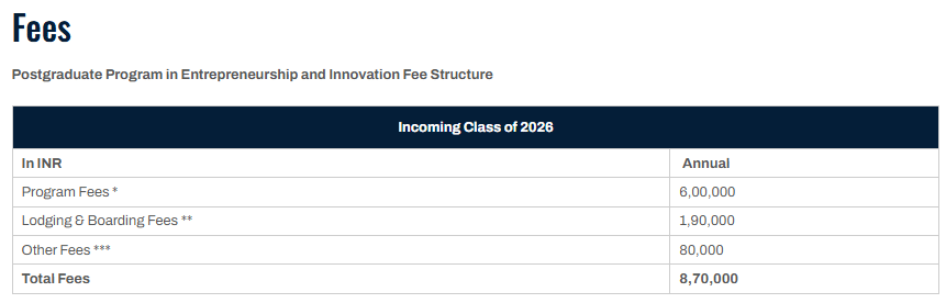 - The total fees for PG Program Entrepreneurship and Innovation is ₹ 8.6 Lakhs.