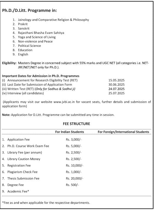 The minimum eligibility for admission to Ph.D Education at Jain Vishwa Bharati Institute Nagaur is Post Graduation+ UGC NET.