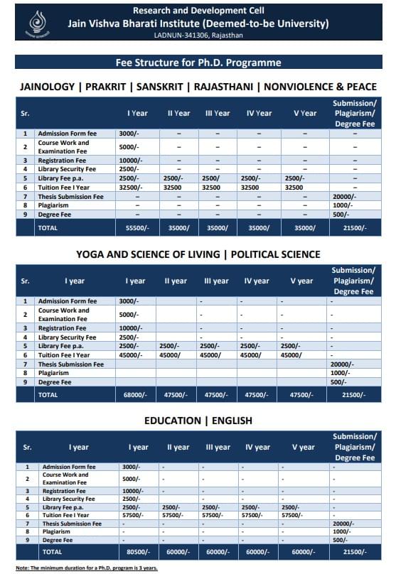Jain Vishwa Bharati Institute Nagaur Ph.D Education fees in first year is ₹ 80,500. The detailed fees is mentioned below.Hostel Fee for Female at Jain Vishwa Bharati Institute Nagaur is ₹ 10,000.