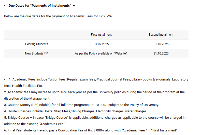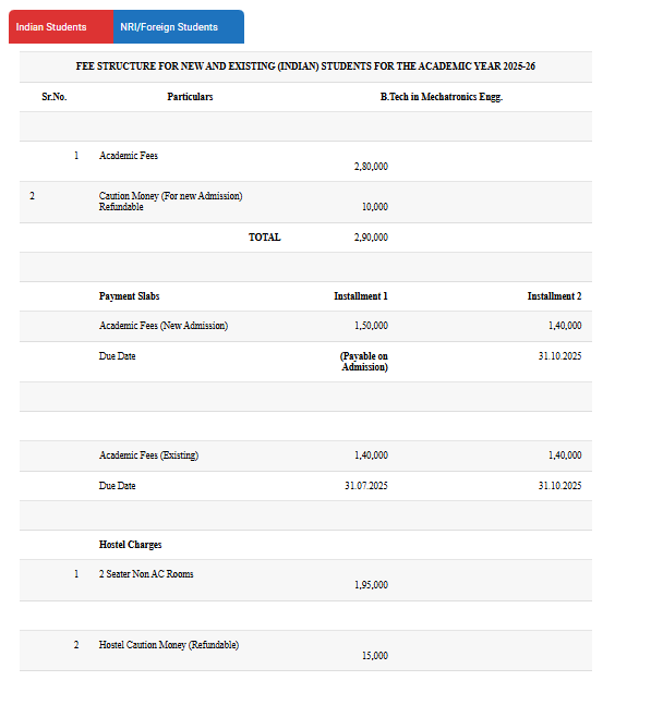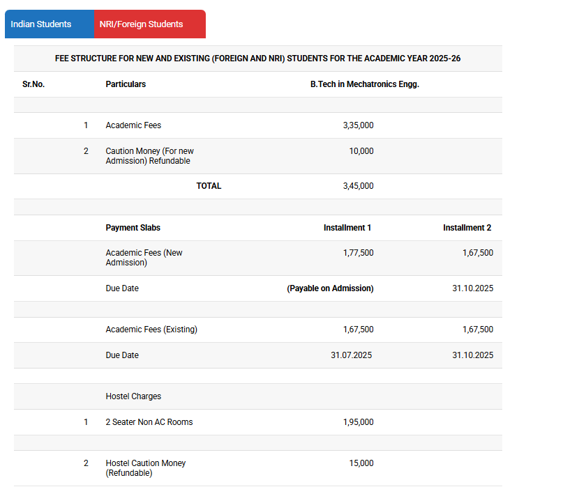 Despite the lack of scholarships, the college offers fee concessions and a loan facility with background checks. Annual costs for a four-year course are about 2.45 lakh INR, excluding hostel accommodation, which costs approximately 2.5 lakh INR per year. The fee structure includes a 10% annual increase, with courses like BTech Mechatronics costing 2.7 lakh INR per year. An initial payment of 1.5 lakh INR is required at admission, with the remainder due in four months.