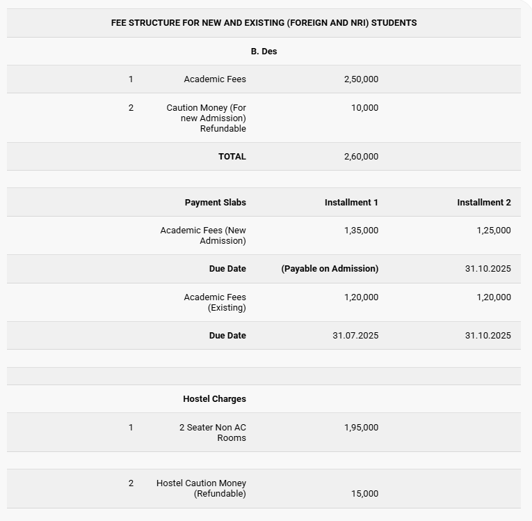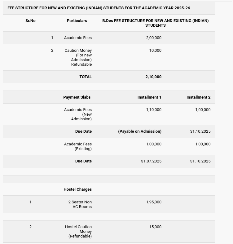 The annual tuition fee is 2 lakh INR, subject to a possible 10% increase each year. Additional costs include a form fee of 2,000 INR, an admission fee of 1 lakh INR for six months, and a refundable 10,000 INR after degree completion. Scholarships are available to assist with financial needs. Admissions can be secured through entrance exams such as NID and UCEED, or via the college's entrance exam, which involves an online test, interview, and portfolio review.
