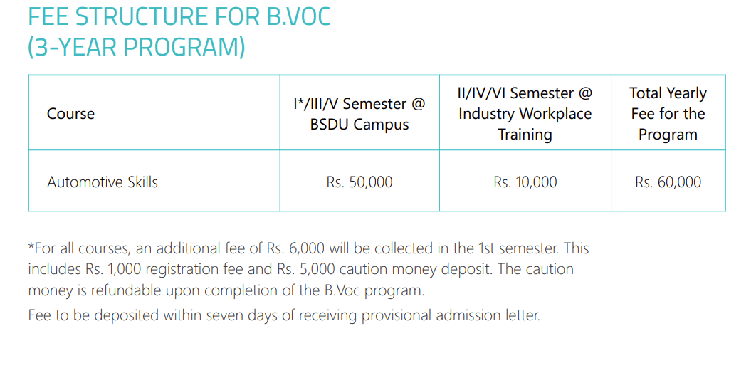 Bhartiya Skill Development University Jaipur B.Voc Automotive Skills is offered as 3 Years Full Time program, with total intake of 30 seats. The minimum eligibility criteria for B.Voc is (10+2) + BSDU-CET. The total fees for Bhartiya Skill Development University Jaipur B.Voc Automotive Skills in 2025 is ₹ 1.86 Lakhs for the complete course duration, which includes total tuition fees of ₹ 1.8 Lakhs. Earlier, the fees in 2020 - 2021 for B.Voc Automotive Skills was ₹ 3.06 Lakhs.