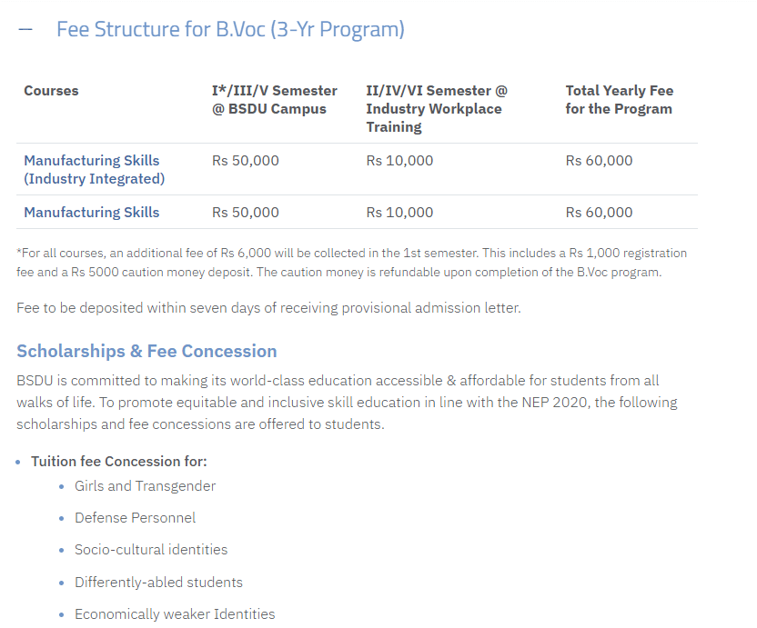 Bhartiya Skill Development University Jaipur B.Voc Manufacturing Skills is offered as 3 Years Full Time program, with total intake of 30 seats. The minimum eligibility criteria for B.Voc is (10+2) + BSDU-CET. The total fees for Bhartiya Skill Development University Jaipur B.Voc Manufacturing Skills in 2025 is ₹ 1.86 Lakhs for the complete course duration, which includes total tuition fees of ₹ 1.8 Lakhs. Earlier, the fees in 2020 - 2021 for B.Voc Manufacturing Skills was ₹ 3.06 Lakhs.