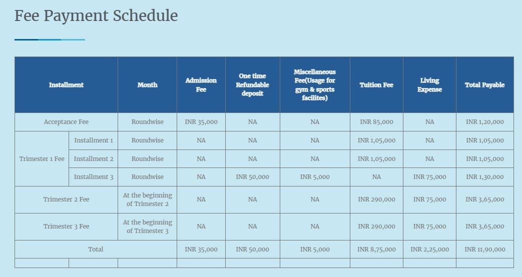 | Fees | Year 1 (in INR) | Year 2 (in INR) | Year 3 (in INR) |