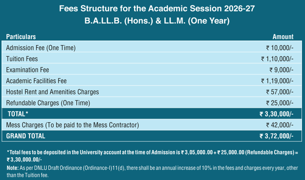 Earlier, BALLB {Hons.} fees at NLU Jabalpur was ₹ 11.65 Lakhs (in 2025) for the entire course duration. This shows a fee increase of ₹ 60,000 over the year.
