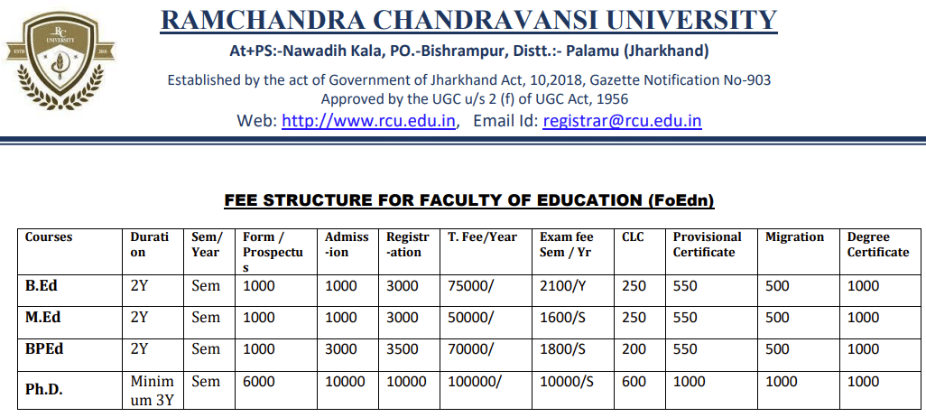 The minimum eligibility for admission to Ph.D Physical Education at RCU Palamu is M.Ed+UGC NET.
