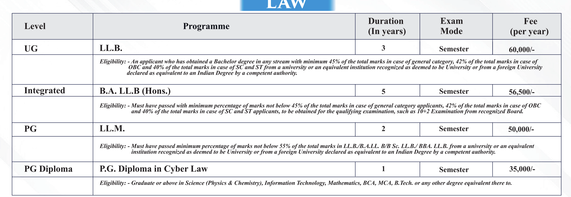 L.L.B Fees at SKU Chhatarpur covers a range of expenses, including tuition fee, course materials, and access to campus facilities.
