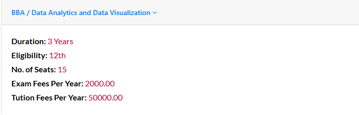 BBA Data Analytics & Data Visualization at Shyam University Dausa is a 3 Years Degree. The course is offered On Campus as a Full Time program. Shyam University Dausa BBA Data Analytics & Data Visualization First Year Fees is INR 52,000 for 2025.