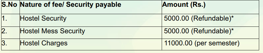 The hostel fee is 10,000 INR per semester, and the mess fee is 125 INR per day, amounting to 3,750 INR per month.