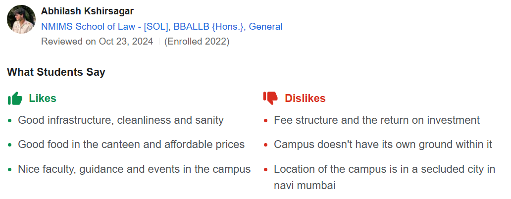| See what Abhilash Kshirsagar, a student of BBALLB {Hons.}, General (Batch of 2022), has to say about the Course Curriculum and Fees at NMIMS School of Law - [SOL].