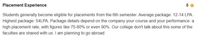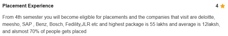 Students become eligible for placements from the 6th semester, with internships starting as early as the 3rd year. Top recruiting companies include Google, Amazon, Infosys, TCS, Cisco, and Mercedes Benz. The placement cell is active and provides training and support to enhance employability. Internships often convert to full-time positions, with stipends ranging from 15,000 to 50,000 per month.