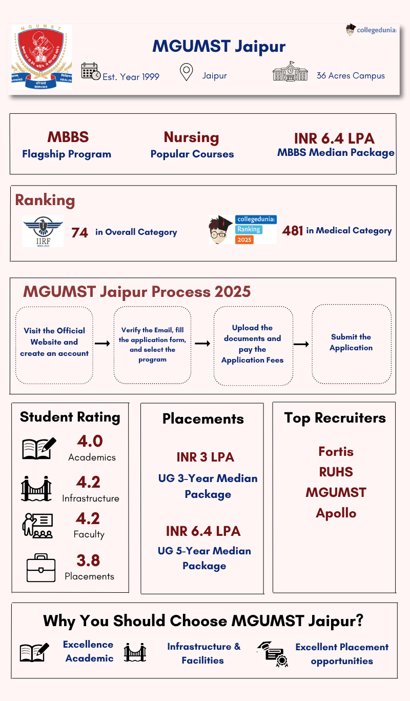 Mahatma Gandhi University of Medical Sciences and Technology (MGUMST) is one of the most renowned universities in medical sciences, established in 1999 by an act of the State Legislature. The university is recognised by the University Grants Commission and approved by the National Medical Commission. MGUMST is composed of five colleges, namely Dental, Medical, Physiotherapy, Occupational Therapy, and Nursing College. It has been ranked 74 in the overall category by the IIRF Rankings 2025 in India. Accredited by NABH-NABL, the university is located in Jaipur, Rajasthan. MGUMST offers undergraduate, postgraduate, short-term, and Doctoral courses in the fields of medicine, physiotherapy, and Nursing.