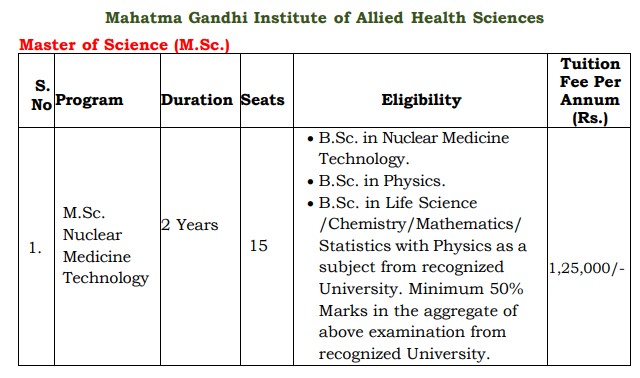 MGUMST B.Sc Physician Assistant is offered as 3 Years Full Time program, with total intake of 60 seats. The minimum eligibility criteria for B.Sc is 10+2. The total fees for MGUMST B.Sc Physician Assistant in 2025 is ₹ 1.73 Lakhs for the complete course duration, which includes total tuition fees of ₹ 1.5 Lakhs. Earlier, the fees in 2020 - 2021 for B.Sc Physician Assistant was ₹ 1.6 Lakhs.