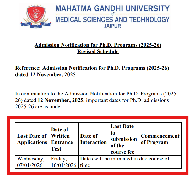 08 Dec, 2025 MGUMST has released the revised schedule for the M.D Nuclear Medicine Admission 2025-26. The last date to apply is Jan 7, 2025. Check details here.