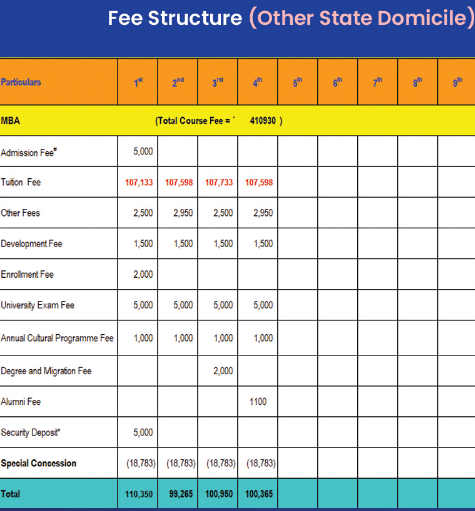 The university guarantees 100% placement with companies like HDFC, GSK, Swiggy, Accenture, and Pepsi, offering roles such as Brand Manager and Sales Manager. The placement cell ensures students are prepared for employment after their third semester, with the highest MBA package being INR 400,000. The BBA program costs INR 130,000 for three years, with an annual fee of INR 52,000. Scholarships and fee relaxations are available for students based on family income, defense service, or previous education at the institution.