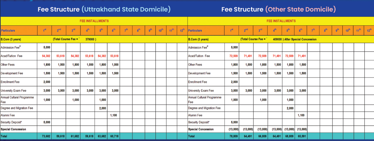 Shri Guru Ram Rai University in Dehradun offers a 3-year B.Com (Hons) program, requiring applicants to have a 10+2 qualification with at least 40% aggregate marks. Admission is based on an entrance exam and 10+2 results. The faculty is knowledgeable and supportive, though frequent changes may affect teaching continuity. The course fee is Rs 1,47,600, with a total cost of around Rs 1.28 lakh, including tuition and other fees. There is a semester fee of Rs 17,650 to 20,000 INR, with no fee hikes.