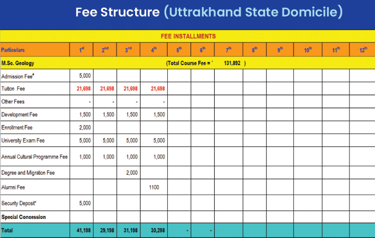 Earlier, M.Sc Geology fees at SGRRU was ₹ 1.55 Lakhs (in 2025) for the entire course duration. This shows a fee increase of ₹ 7,000 over the year.