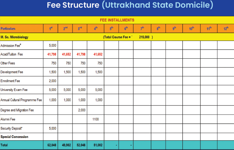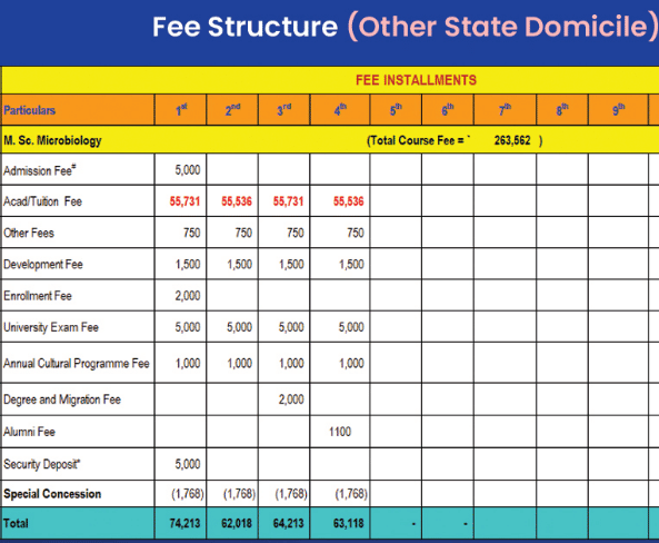 Earlier, M.Sc Microbiology fees at SGRRU was ₹ 2.65 Lakhs (in 2025) for the entire course duration. This shows a fee increase of ₹ 7,000 over the year.