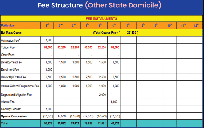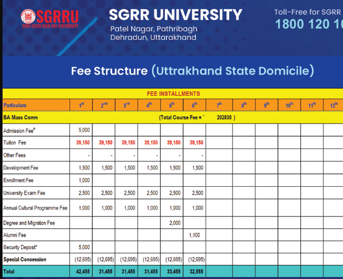 Shri Guru Ram Rai University in Dehradun, Uttarakhand offers an affordable Bachelor of Journalism and Mass Communication program. The course, known for its approachable faculty and effective teaching methods, spans 6 semesters with a fee of 8,000 INR per semester, totaling about 48,000 INR. Dr. Asha Bala and Dr. Ashish, the Head of Department, are especially praised for their clear teaching styles.