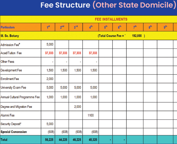 Earlier, M.Sc Botany fees at SGRRU was ₹ 1.49 Lakhs (in 2025) for the entire course duration. This shows a fee increase of ₹ 46,100 over the year.