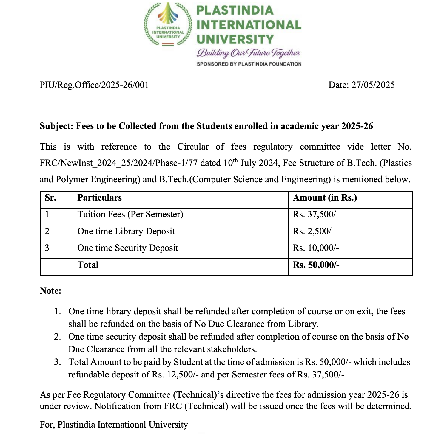 PlastIndia International University B.Tech Computer Science and Engineering fees in first year is ₹ 87,500. The detailed fees is mentioned below.Admissions are offered based on JEE-Main.