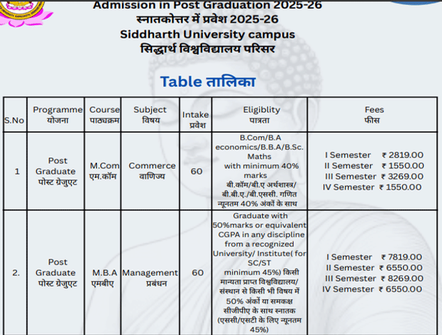 The minimum eligibility for admission to M.Com at Siddharth University Siddharthnagar is Graduation with 40%.