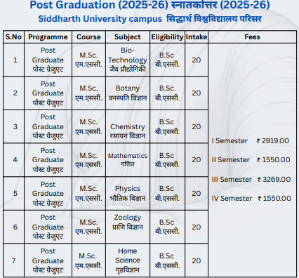 The minimum eligibility for admission to M.Sc Zoology at Siddharth University Siddharthnagar is Graduation with 40%.