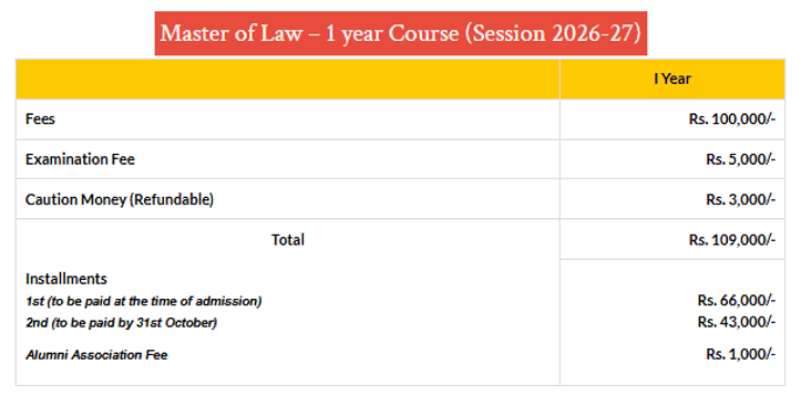 Earlier, L.L.M Criminal Law fees at United University Allahabad was ₹ 93,000 (in 2025) for the entire course duration. This shows a fee increase of ₹ 16,000 over the year.
