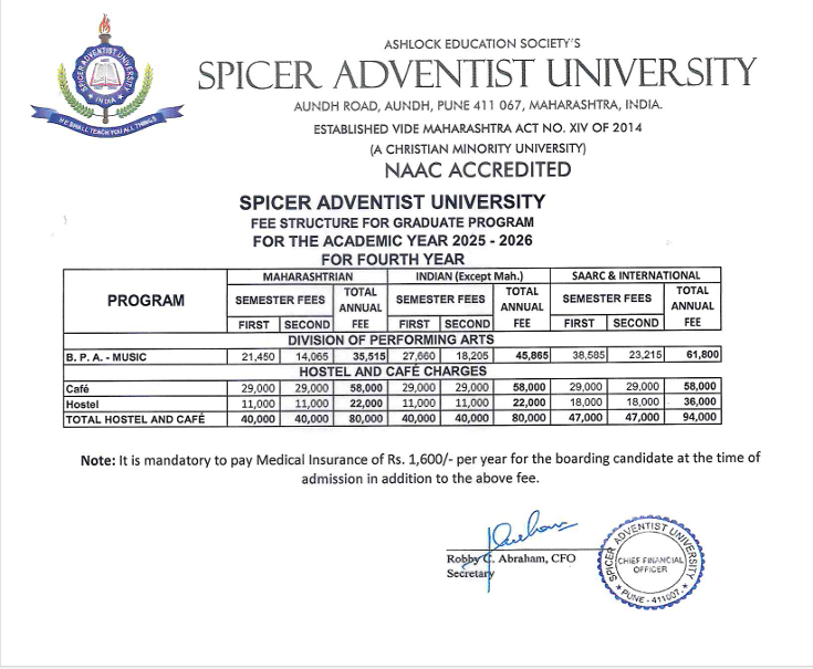 Spicer Adventist University Pune BPA Music fees in first year is ₹ 98,850. The detailed fees is mentioned below.Spicer Adventist University Pune Hostel Fee is ₹ 94,000.