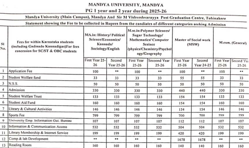 Mandya University M.Sc Physics is offered as 2 Years Full Time program, with total intake of 30 seats. The minimum eligibility criteria for M.Sc is Graduation. The total fees for Mandya University M.Sc Physics in 2025 is ₹ 44,540 for the complete course duration, which includes total tuition fees of ₹ 44,540.