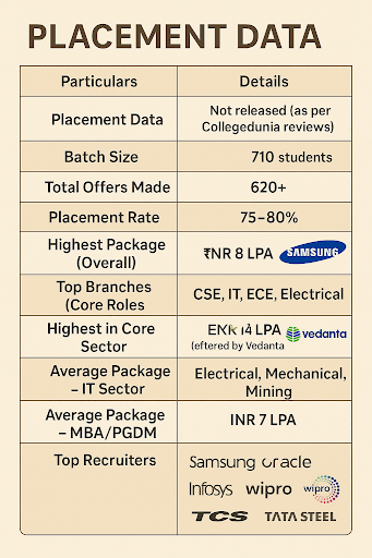 In 2020, 26 out of 60 students were placed, while in 2023, 900 placement offers were made. The college hosts companies such as Tata Steel, Vedanta, TCS, Wipro, and others for on-campus placements. The highest salary package ranges from 2.2 to 16.5 lakh per annum, with the average package being around 3 lakh per annum.