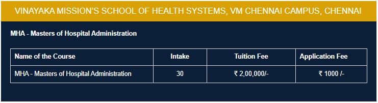 Vinayaka Mission's Research Foundation VMRF Salem offers a total of 30 seats for M.H.A [Hospital] Hospital Administration. Candidates must have at least Graduation to be eligible for admissions.