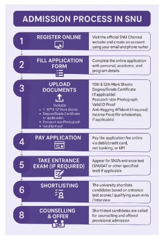 Shortlisted candidates attend an on-campus interview with faculty members, assessing communication skills and other capabilities. The entire admissions procedure spans up to 1.5 months. The university does not offer direct admission or management quota seats, ensuring a fair, competitive system. Students compare SNU with institutions like VIT, SRM, Amrita, Thapar, Manipal, and Jaypee, often highlighting its advantageous faculty focus, limited seat availability, and modern infrastructure. Despite its recent establishment, SNU's academic excellence, state-of-the-art campus, futuristics courses, balance of curriculum and industry exposure, bolster its reputation as a commendable choice among peers.