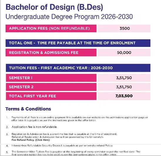 Over 100 students have been successfully hired based on their portfolio results. The total tuition fee for the 4-year program is Rs. 24,00,000, divided into Rs. 3,00,000 per semester, with an initial admission fee of Rs. 75,000. Scholarships are available and can significantly reduce fees, as seen in a case where a student received a Rs. 6,00,000 deduction. Eligibility for scholarships includes criteria such as having a parent who is a teacher, an annual household income below Rs. 20,00,000, or a parent who is a military servant.