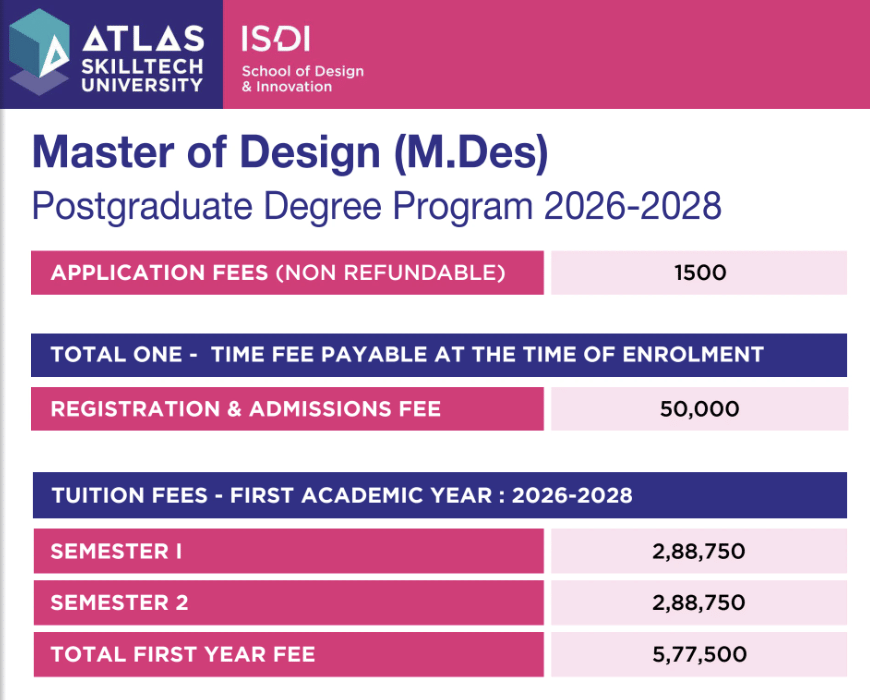 Earlier, M.Des Design Futures fees at ATLAS SkillTech University Mumbai was ₹ 11.45 Lakhs (in 2025) for the entire course duration. This shows a fee increase of ₹ 60,000 over the year.