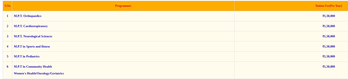 Dhanalakshmi Srinivasan University Tiruchirappalli M.P.T Orthopaedics fees in first year is ₹ 1.65 Lakhs. The detailed fees is mentioned below.Dhanalakshmi Srinivasan University Tiruchirappalli Hostel Fee is ₹ 85,000 to 1.5 Lakhs.