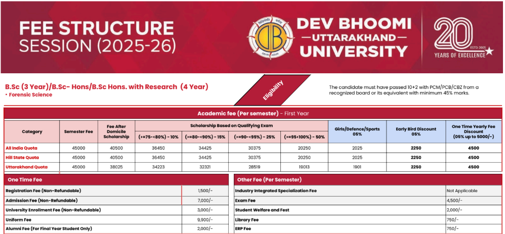 The minimum eligibility for admission to B.Sc Forensic Sciences at DBUU, DBIT is 10+2 with 45%.