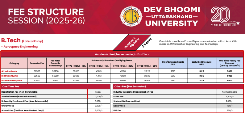 DBUU, DBIT B.Tech {Lateral} Aerospace Engineering fees in first year is ₹ 1.62 Lakhs. The detailed fees is mentioned below.DBUU, DBIT Hostel Fee for Male is ₹ 80,000 to 1.25 Lakhs. Hostel Fee for Female at DBUU, DBIT is ₹ 95,000 to 1.35 Lakhs.