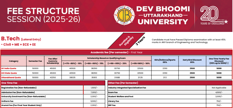 DBUU, DBIT B.Tech {Lateral} Mechanical Engineering is offered as 3 Years Full Time program. The minimum eligibility criteria for B.Tech {Lateral} is 10+3 with 45%. The total fees for DBUU, DBIT B.Tech {Lateral} Mechanical Engineering in 2025 is ₹ 3.71 Lakhs for the complete course duration, which includes total tuition fees of ₹ 3 Lakhs. Earlier, the fees in 2023 - 2024 for B.Tech {Lateral} Mechanical Engineering was ₹ 3 Lakhs.