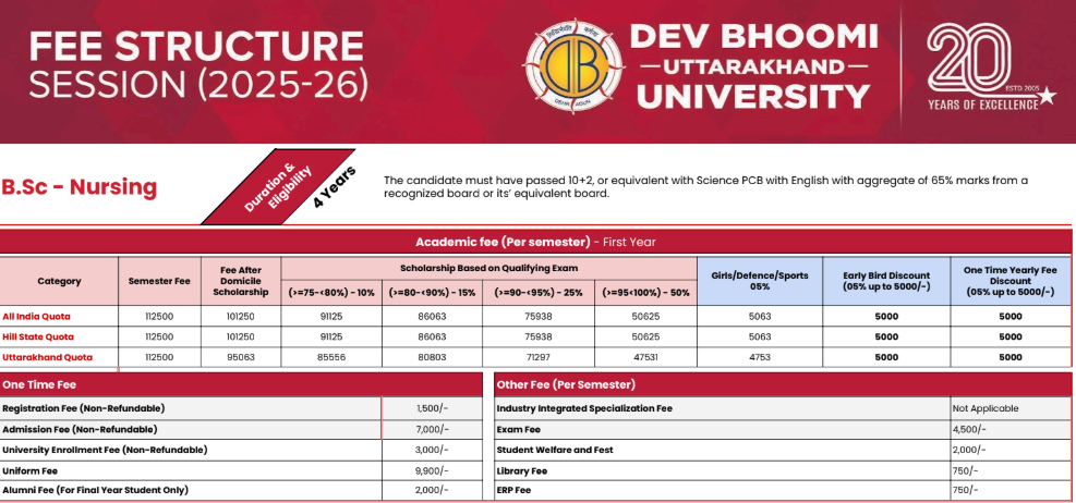 The DBUU B.Sc. in Nursing program costs a total of INR 8.40 Lakh in tuition fees, with an additional one-time admission fee of INR 21,400 and a hostel fee of INR 3.25 Lakh. Scholarships are available for specific categories, with SC/ST students receiving a 50% scholarship and OBC students receiving a 25% scholarship.
