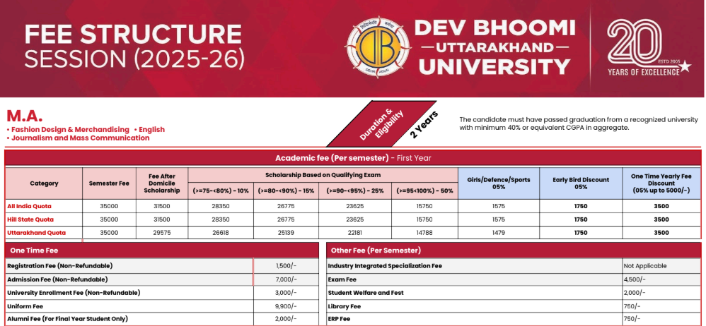DBUU, DBIT MA Journalism & Mass Communication is offered as 2 Years Full Time program. The minimum eligibility criteria for MA is Graduation with 40%. The total fees for DBUU, DBIT MA Journalism & Mass Communication in 2025 is ₹ 1.95 Lakhs for the complete course duration, which includes total tuition fees of ₹ 1.4 Lakhs. Earlier, the fees in 2024 - 2025 for MA Journalism & Mass Communication was ₹ 1.2 Lakhs.