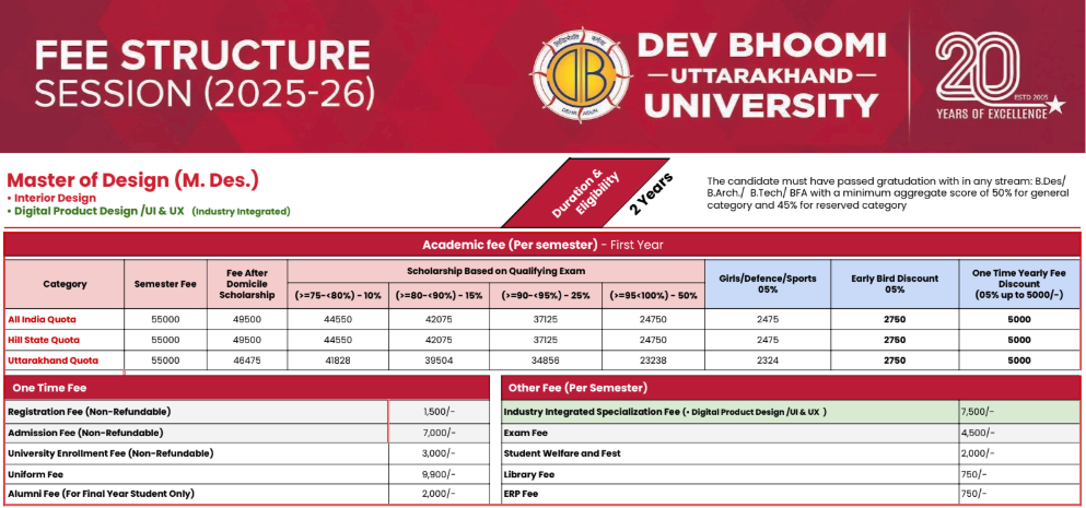 The minimum eligibility for admission to M.Des Interior Design at DBUU, DBIT is Graduation with 50%.